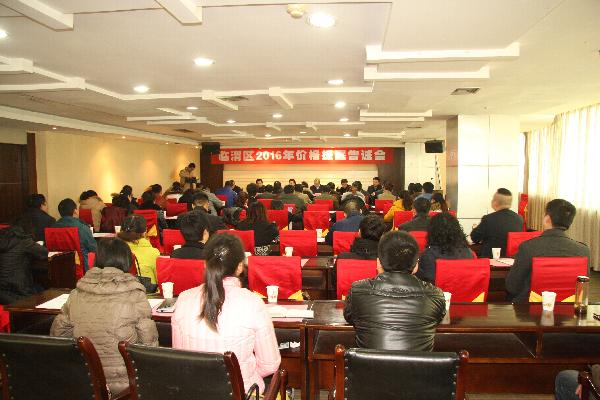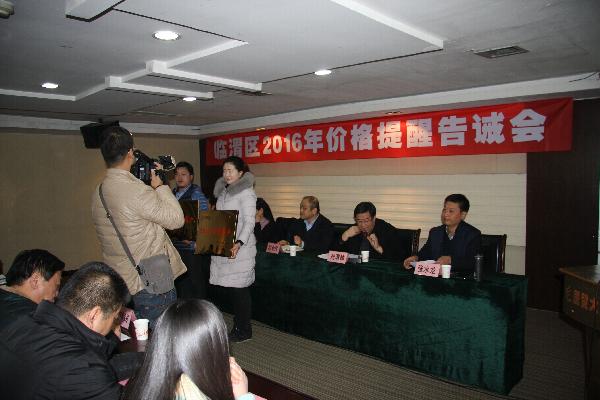为进一步规范市场价格秩序,维护经营者和消费者合法权益,推进价格诚信建设,全面搞好2016年价格管理工作,1月26日上午,临渭区物价局在国贸大酒店召开2016年价格提醒告诫会,渭南城区大型超市商场零售业、餐饮、物业、客运等四大行业26家40余名代表及区商务局、住建局物业办、交通局运管所、老城办相关同志参加了会议,市物价局程金民副局长、区人民政府杨美玲副区长出席会议。