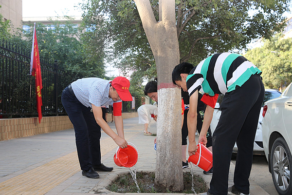 连续四十多天,渭南主城区滴雨未落,气温高居不下,为居民们遮阴挡阳的绿色树木们都精神不振,尤其是在背街小巷里的一些行道树、花木更是缺水严重,临渭区园林处出动了9辆灌溉车沿着城市主干道为党员志愿者们供水浇树。在仓城路南段、西一路南段,临渭区委组织部、市文明办、市水利局、区城投公司等党员志愿者们拎着水桶、拿着水盆发动沿街商户们一起,给干渴的草木们浇水养护。
