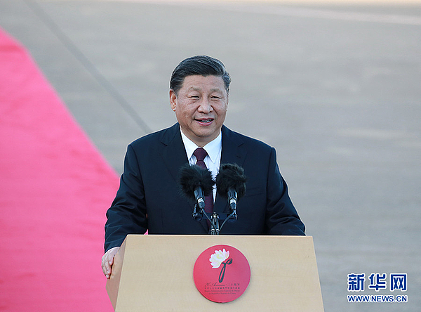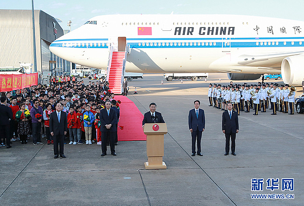 12月18日,中共中央总书记、国家主席、中央军委主席习近平乘专机抵达澳门,出席将于20日举行的庆祝澳门回归祖国20周年大会暨澳门特别行政区第五届政府就职典礼并视察澳门。这是习近平在机场发表重要讲话。新华社记者 谢环驰 摄