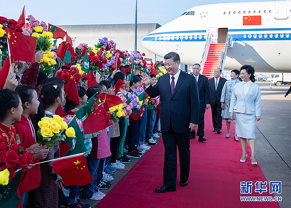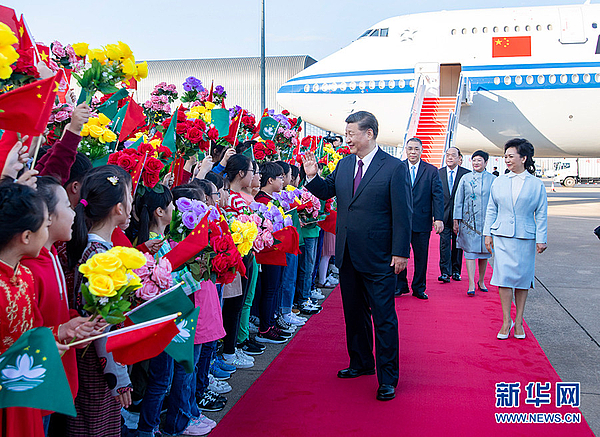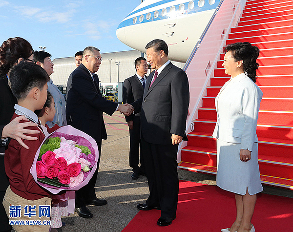 16时许,习近平乘坐的专机徐徐降落在澳门国际机场。习近平和夫人彭丽媛走出舱门,向欢迎人群挥手致意。澳门警察乐队奏响热情喜庆的欢迎曲,现场一片欢腾。舷梯旁,两名澳门少年儿童向习近平和彭丽媛献上鲜花。在澳门特别行政区行政长官崔世安和夫人霍慧芬陪同下,习近平和彭丽媛同前来迎接的人员亲切握手。数百名澳门青少年和各界群众代表挥动国旗、特别行政区区旗和鲜花,热烈欢迎习近平的到来。